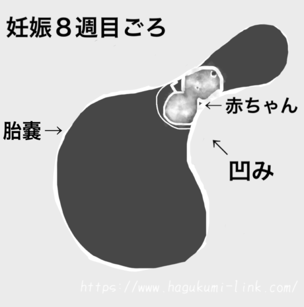 7週目までのエコー写真では、胎嚢に若干の凹みはあったものの大きな凹みはなかったので特に気にすることはありませんでしたが、8週目のエコーでは、胎嚢がひょうたんのような形になっていて赤ちゃんの横にコブのようなものが写っていました。