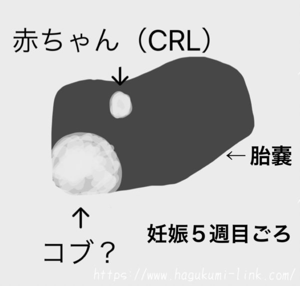 5週目ごろのエコー写真を見てみると、大きな凹みはないものの胎嚢の中に赤ちゃんと、赤ちゃんの5倍ほどあるコブのようなものが写っていました。